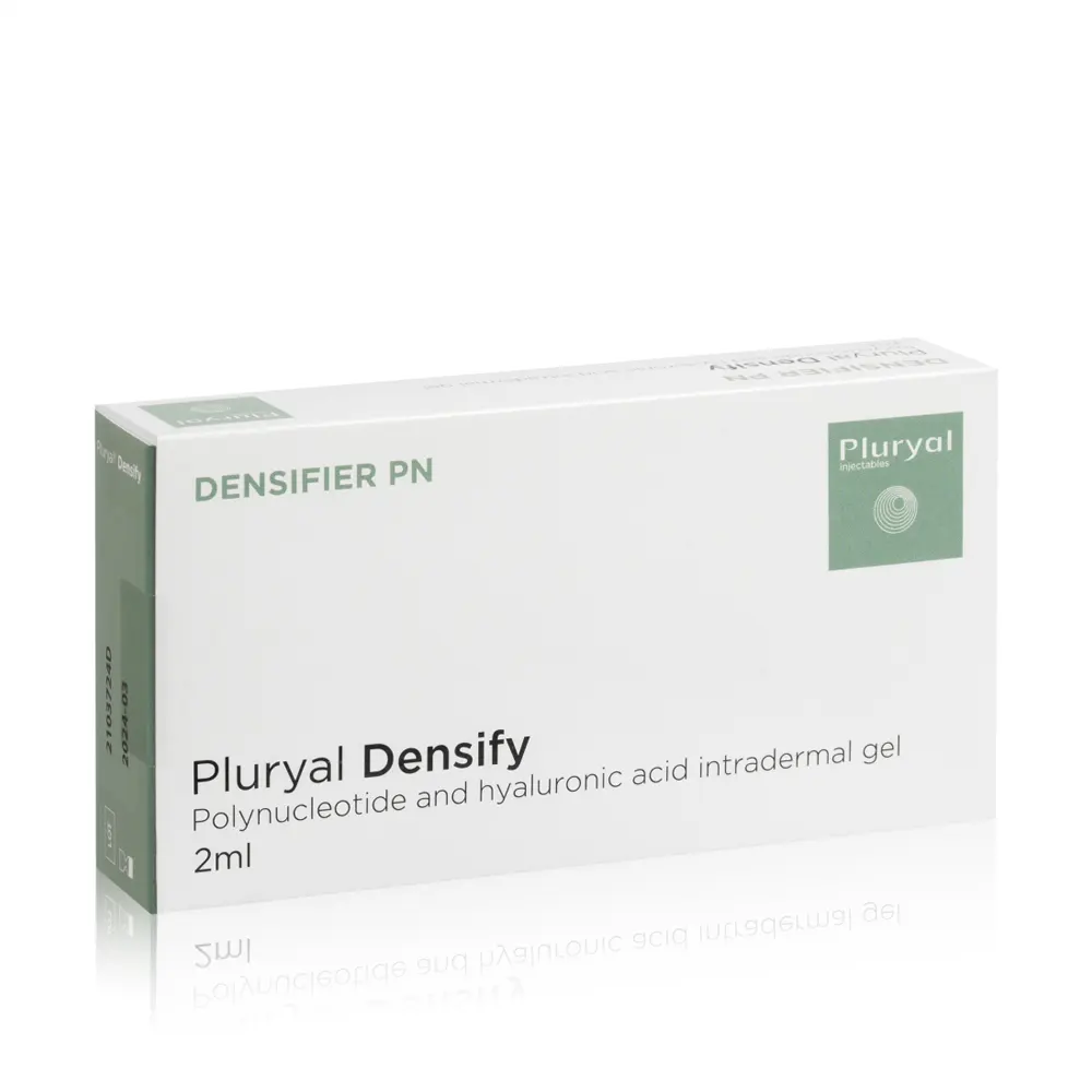 Pluryal Densify to wiskoelastyczny, niepirogenny preparat przeznaczony do rewitalizacji i regeneracji skóry. Zawarte w składzie polinukleotydy w stężeniu 10mg/ml w połączeniu z kwasem hialuronowym o tym samym stężeniu nadają się do rewitalizacji skóry. Przeprowadzenie pełnego protokołu zabiegowego spowoduje poprawę napięcia, wygładzenie, indukcję syntezy kolagenu i elastyny oraz nawilżenie skóry. Cera odzyskuje naturalny i zdrowy wygląd.